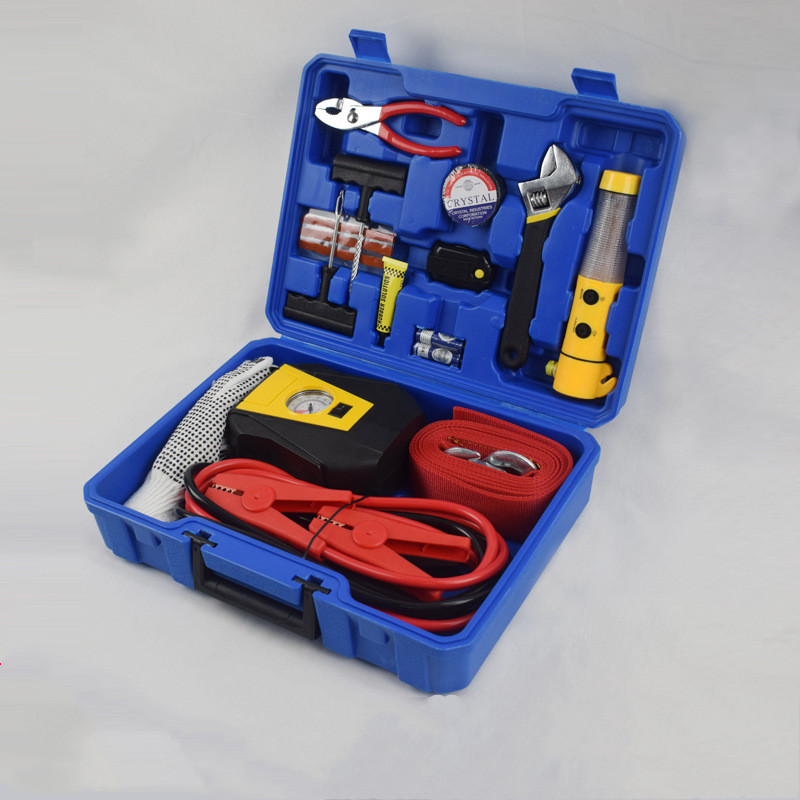 • Custom Vehicle Car Emergency Tool Kit Automobile Tool Box Air Pump Booster Cable Tow Rope with Flashing Warning